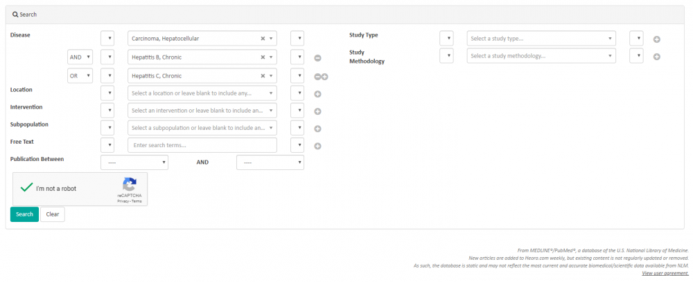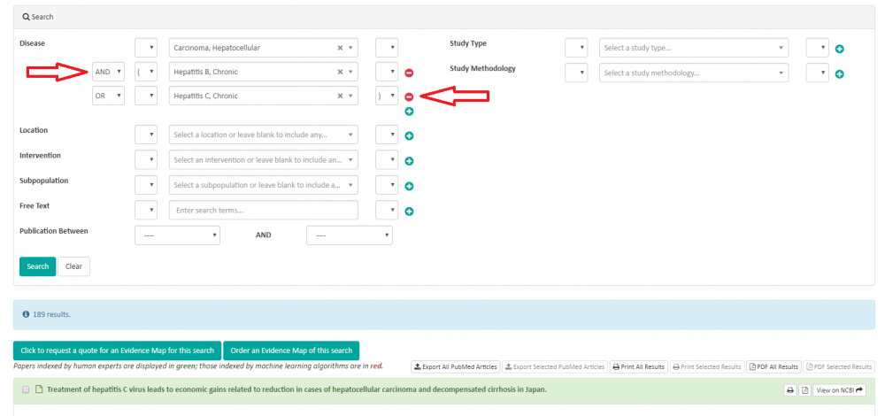 Use the Boolean operator brackets for additional clarity. In the example below, we are searching for Carcinoma, hepatocellular AND (Hepatitis B, chronic OR hepatitis C, chronic). The search will identify abstracts that are all relevant to hepatocellular carcinoma and that are also about either chronic hepatitis B or chronic hepatitis C infection. In April 2020, this search identified 189 relevant abstracts.