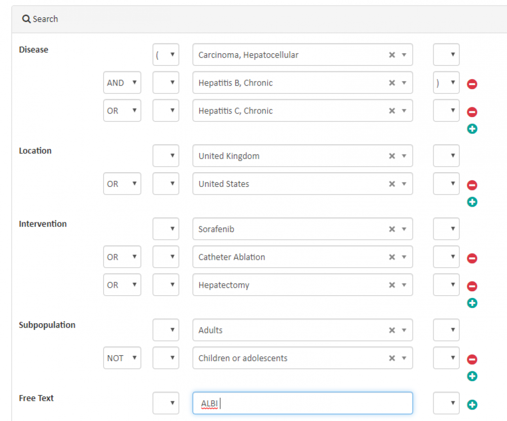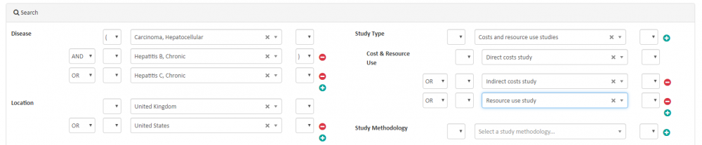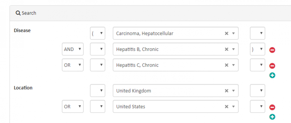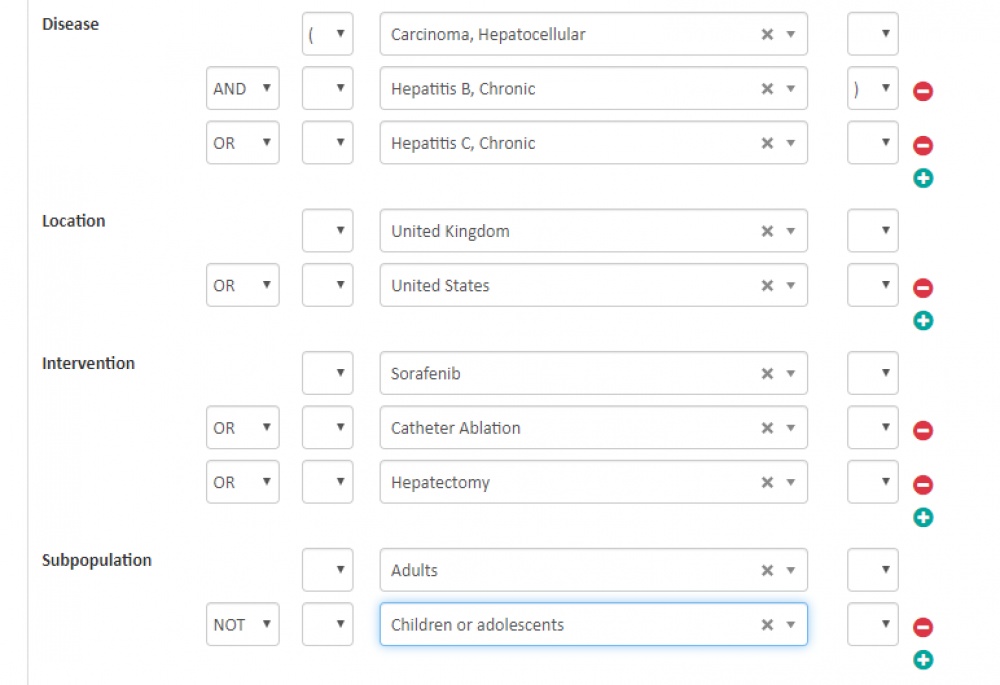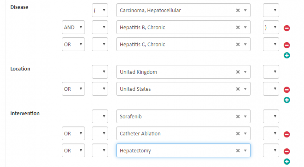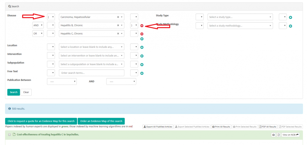 In contrast, in the example below we are searching for (Carcinoma, hepatocellular AND Hepatitis B, chronic) OR Hepatitis C, chronic. The search will find abstracts that are either about hepatocellular carcinoma and chronic hepatitis B, or are about chronic hepatitis C infection. In April 2020, this search identified at least 500 abstracts.