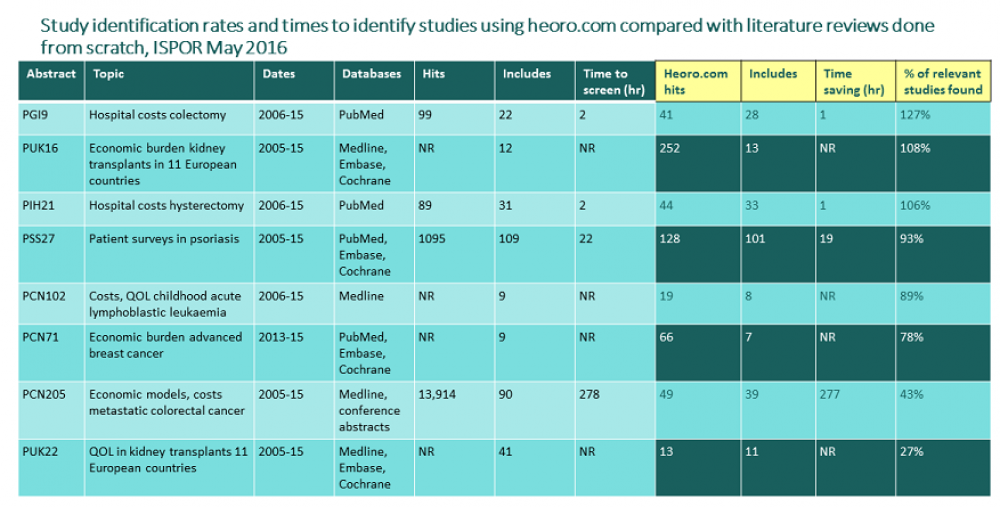 We used our training set of 10,000 indexed abstracts to train natural language processing software to index the remaining 90,000 abstracts, with an average of 95% accuracy. This means that users of heoro.com can instantly find relevant abstracts by searching for the disease, intervention, study type and geographical location of interest. The specificity of our detailed ontology mapping means that users don't have to wade through hundreds of irrelevant abstracts to find those they need. The accuracy of our software indexing means that our database is comprehensive, with users able to access all relevant abstracts from the 100,000 found by our initial search. But how well does heoro.com compare with burden of illness reviews conducted from scratch? As we were at ISPOR DC, we decided to start there in evaluating our database. We identified poster abstracts in the congress proceedings that were targeted or systematic reviews on the quality of life, costs or resource use, adherence with treatments, or economic models of interventions, where the number of relevant papers was reported in the abstract. We then ran a search of heoro.com for the same topics, to see how many relevant papers could be found from our database of PubMed indexed studies. We found 30 relevant abstracts, of which 9 searched for studies within the 2005-2016 dates relevant to heoro.com, 8 of which reported the number of relevant studies included after abstract screening and 4 also reported the number of abstracts found by their original search. We then used heoro.com to identify studies on the same topic for each of these 8 reviews. The comparison is shown in the table below. For three of the reviews, heoro.com identified more studies than the original review, and for a further three, it identified between 78% and 93% of the total number of studies included in the original review - in the two of examples where the percentage was below 90%, heoro.com fell short by only 1 or 2 papers. The performance of heoro.com was less good in 2 of the 8 reviews, finding less than half the number of papers identified by the search of more databases in the original reviews. However, even in these cases, heoro.com could be helpful, by finding some relevant papers in a substantially shorter time than the original abstract screening would have taken, saving an estimated 277 hours of screening time to find 43% of the number of papers identified by one review.