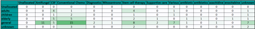 A total of 59 different intervention methods were identified which were categorised into 12 categories, of which conventional chemotherapy was the most popular intervention type (26 abstracts), followed by stem cell therapy (16) and colony-stimulating factors (13). Other interventions include mitoxantrone, enocitabine and azacytidine. Whilst most abstracts (49) recruited general members of the acute myeloid leukaemia population, some included specific populations. Ten abstracts cited the used of adults, 11 assessed an elderly population and 5 evaluated children, while 6 did not specify a population type.