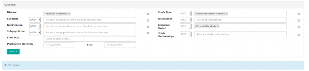 We searched the heoro.com database for the disease Multiple sclerosis, study type Economic models and selected cost-utility models from the list of options, as shown below.