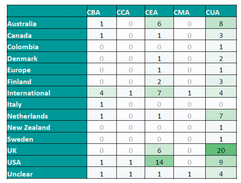 Most of the evaluations were cost-utility models (63 abstracts), followed by cost-effectiveness (38 abstracts), cost-benefit (10 abstracts), and cost-consequence or cost-minimisation models (5 abstracts).