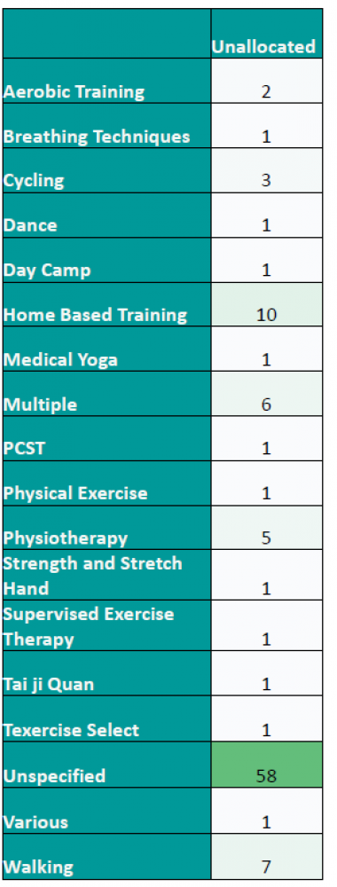 Economic model studies for exercise therapy have most commonly explored home based training methods and focused on healthy individuals, although a large proportion (58%) of the interventions were unspecified.