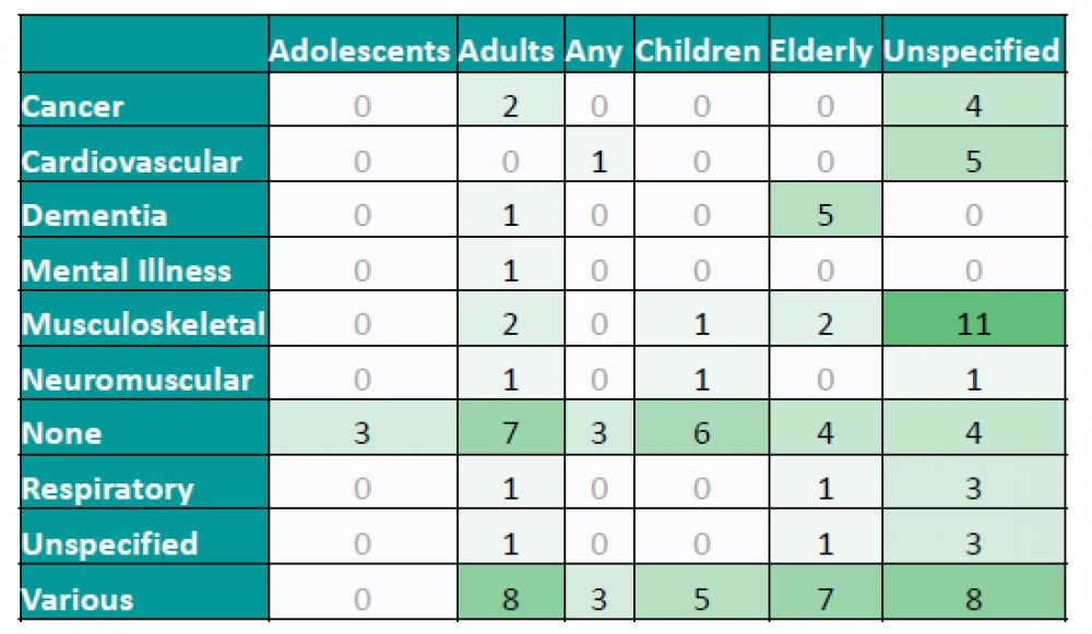 The studies most frequently concerned adults (24 abstracts) and the elderly (20 abstracts). Of the specified activity types, home based training was the most widely modelled (10 abstracts), followed by physiotherapy (5 abstracts), but most studies did not specify the type of exercise.