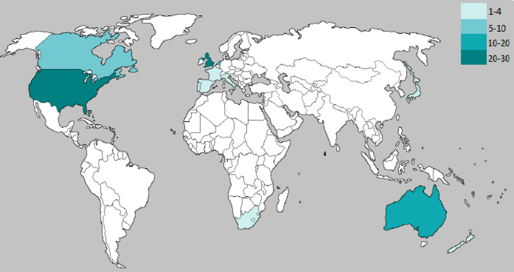 The 100 publications were relevant to 13 jurisdictions. The UK was the most frequent location for the studies (24 abstracts) followed by the USA (23 abstracts), Australia (13 abstracts), the Netherlands (8 abstracts) and Canada (5 abstracts).