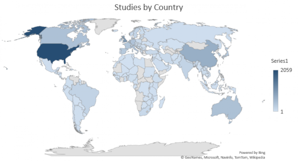 Abstracts originated from 133 countries, with the USA (2059 publications) and the United Kingdom (1015 publications) being the highest, as seen in Figure 3.