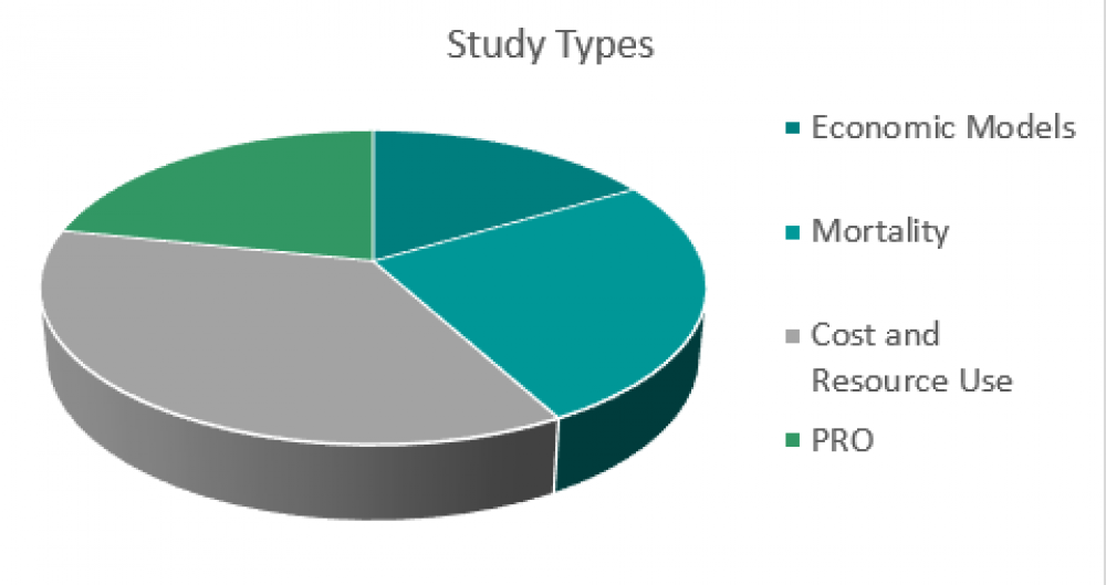 The most common study type was cost and resource use (2180 publications), followed by mortality studies (1534 publications), PRO studies (1305 publications) and Economic models (991 publications). This is represented in Figure 2.