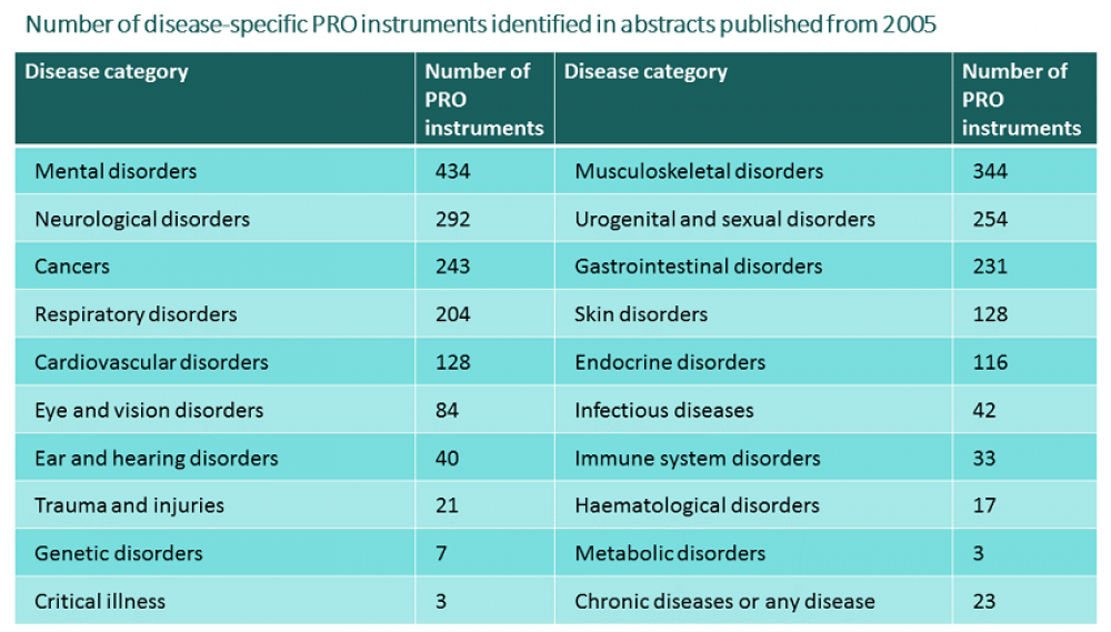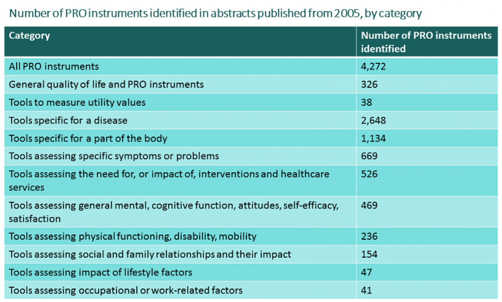 The new heoro.com database launched successfully at ISPOR DC last week. We've developed an ontology of the 4,250 PRO tools we identified from more than 22,200 PRO study abstracts in the database. Creating a new ontology is time-consuming work. We based the disease ontology in heoro.com on MeSH terms from PubMed, the source of the 100,000-plus abstracts we identified from a systematic search from 2005. Our intervention ontology also draws on MeSH terms for treatments, combined with lists of pharmaceutical products licensed in a number of countries including the US and UK, and is updated as studies on new products are published. With our patient-reported outcome (PRO) instrument ontology, though, we started from scratch: First, we identified all the instruments measuring quality of life, utilities, and other patient, family, caregiver or clinician outcomes, experiences and views from the 3,915 abstracts we identified in our training set of 10,000 abstracts moderated by experts in clinical medicine and health economics and outcomes research (HEOR). Then, we developed unique natural language processing software, with around 95% accuracy for identifying PRO study publications in the 90,000 unmoderated papers in the database. The software identified a further 18,339 abstracts that were likely to be PRO studies. Finally, our experts supplemented and indexed the list of PRO instruments by manually going through all 18,339 abstracts. The tables below summarise what we found.