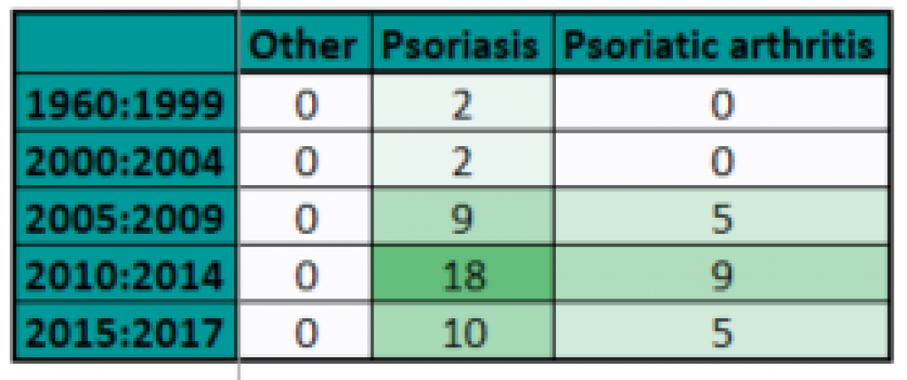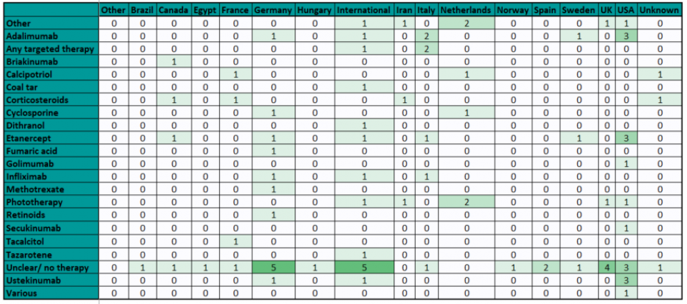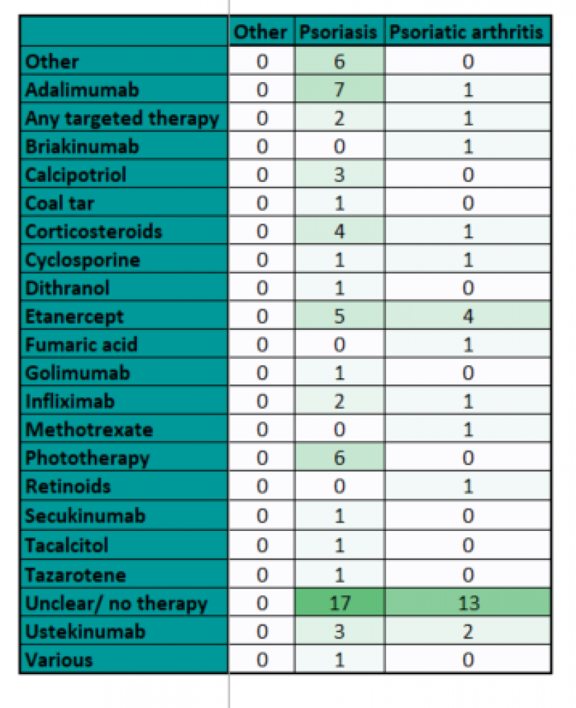 Interventions studied included targeted therapies, in particular adalimumab (8 abstracts), etanercept (8), ustekinumab (5)and infliximab (3), phototherapy (6 abstracts), corticosteroids (4) and cyclosporine (2), although no specific treatment was cited in 28 abstracts.