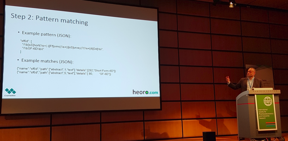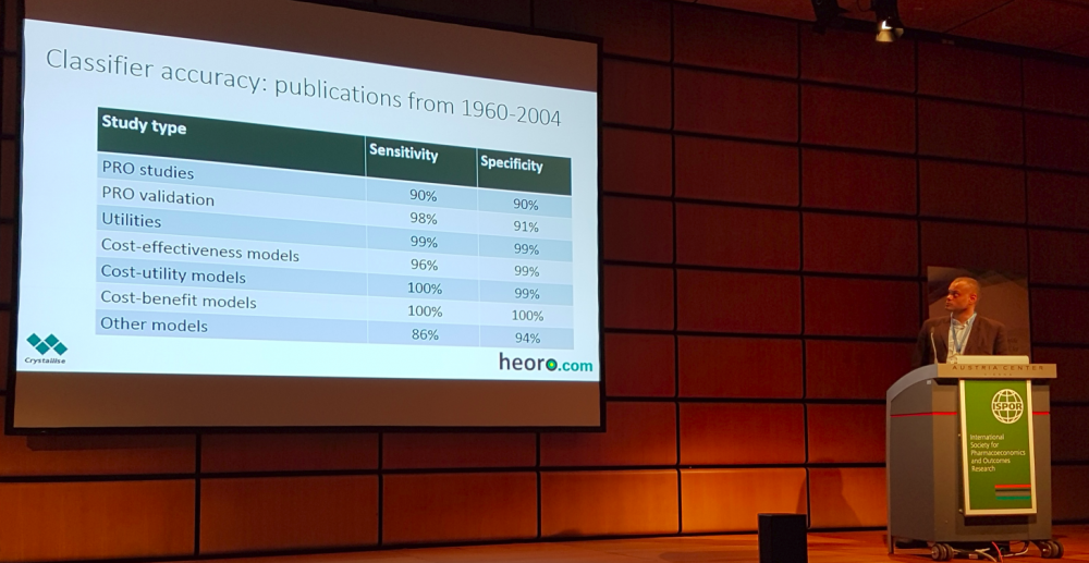 He explained his method for identifying features in the text and metadata of each abstract that best predicted whether the study was reporting patient-reported outcomes, costs and resource use, economic analyses or mortality.