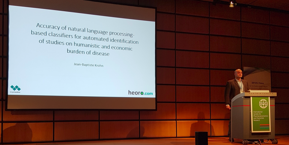 Jean-Baptiste Krohn of Krohn Consulting Ltd. presented our methodology for developing classifiers to index over 180,000 abstracts to study types and subtypes relevant to health economics and outcomes research before an audience of well over 100 delegates.