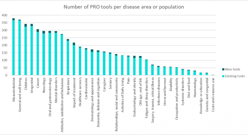 Here is a quick overview of the diseases and populations that had new PRO tools developed in 2018. The main areas of development have been in tools for use with children, in cancer or nervous system disorders, and tools assessing the impacts of treatment on patients. In contrast, there were relatively few instruments developed for haematological disorders, genetic disorders, infections and cardiovascular diseases.