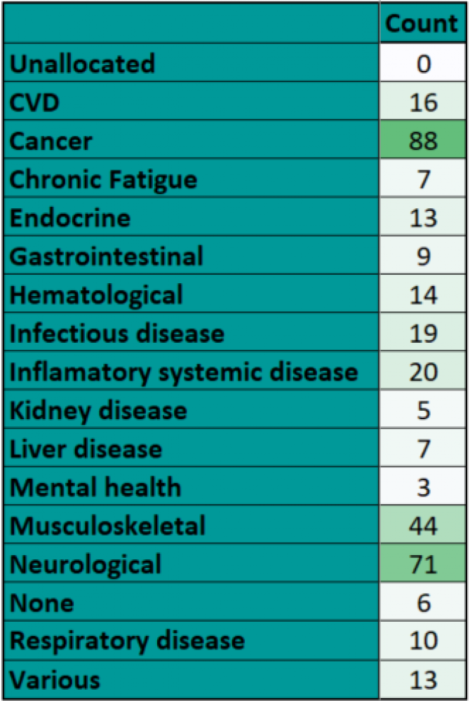 The 348 papers measured fatigue in 76 different disease areas which were classified into 15 disease groups, the most frequently stated being cancer (88 abstracts) followed by neurological disorders (71), musculoskeletal disorders (44) and systemic inflammatory diseases (20).
