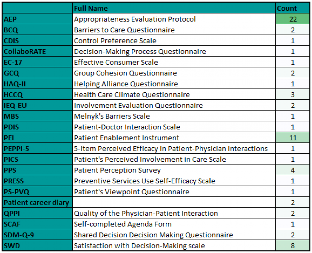 A range of instruments are available for assessing patient involvement, however only a few are used widely, and overall there is a limited number of publications that include a measure of patient involvement.