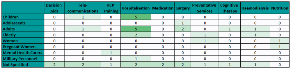 Using an Evidence Map to present the findings we were able to easily explore the results. Examples are shown below, and to download a free copy of the map click here. To use the Map, open it in Excel and enable macros.