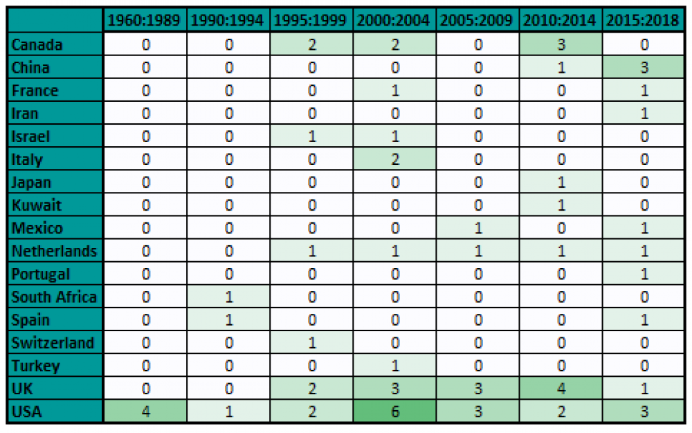 The abstracts identified ranged in publication dates from 1987 to 2018, with an interesting peak in publications between 2000 and 2004. When displayed as a function of the location of the studies it is possible to see that all of these studies were conducted either in the USA, Canada, or Europe.