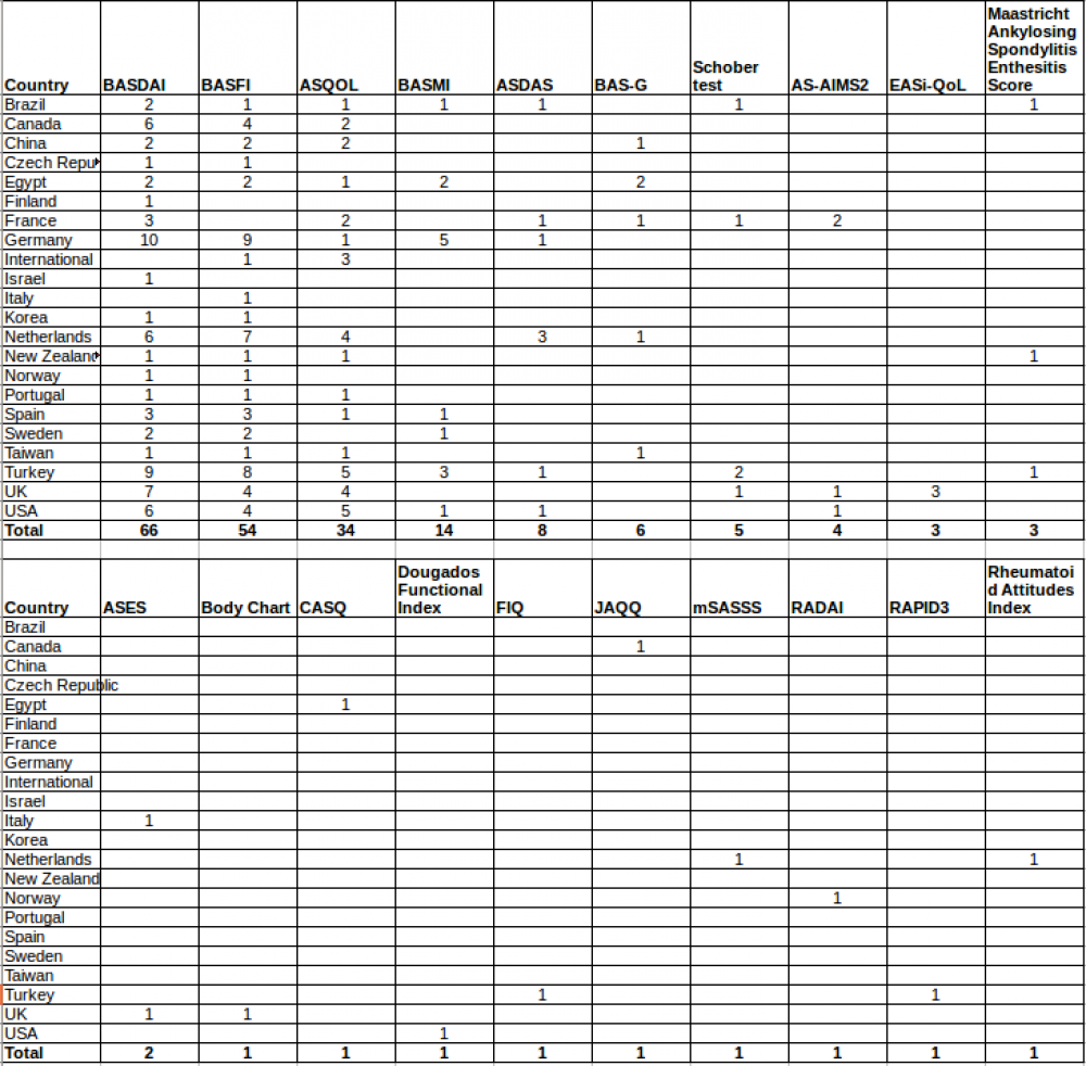 The 128 abstracts cited a total of 64 different PRO instruments. Of these, 22 instruments were specific for AS or other inflammatory arthritis, 27 were general instruments used to evaluate quality of life or utilities, 12 assessed non-disease-specific symptoms, in particular fatigue, or other conditions or diseases that were common comorbidities of people with AS, and three evaluated the impact of the disease on work productivity. The most frequently used tool was the BASDAI, cited in 66 abstracts, followed by the BASFI (54 abstracts), SF-36 (52 abstracts), AS Quality of life questionnaire (34), Health Assessment Questionnaire (20) and the EQ-5D (14).