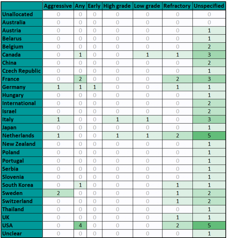 The USA was the most frequent location for the studies, with 13 abstracts, followed by the Netherlands (9), Canada (7) and France (7). Lymphoma stage was most commonly unspecified, but 6 reported refractory stage, 5 aggressive, 3 low grade, 2 high grade and 1 early stage.