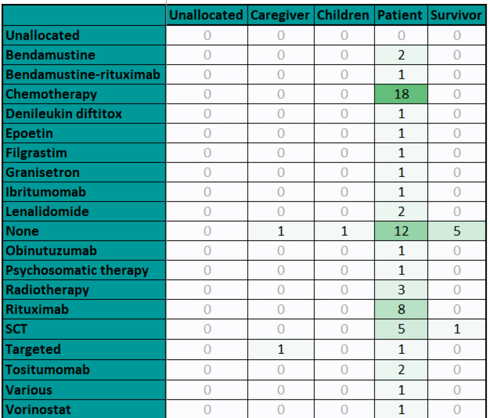 Sixteen different interventions were recorded, with traditional chemotherapy regimes being the most reported (15 abstracts) followed by rituximab (9) and radiotherapy (3); other interventions assessed in 1 or 2 abstracts included ibritumomab, lenalidomide, obinutuzumab, tositumomab and vorinostat. The studies most frequently recruited general members of the lymphoma population with no specified age group (36), but 7 abstracts cited an elderly population specifically, 6 assessed survivors, 2 assessed caregivers and 1 assessed children.