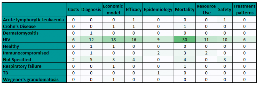 The search identified 66 independent abstracts, 50 of which included patients with HIV. Most of these studies included details on mortality, and included an economic model.