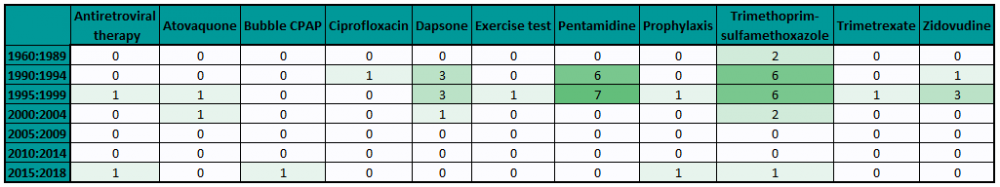 Further inspection of the pattern of evidence for the interventions studied revealed that the bulk of those looking at pentamidine or trimethoprim-sulfamethoxazole were conducted between 1990 and 1999. In fact, very few studies published since 2000 on Pneumocystic pneumonia have included an explicit intervention.